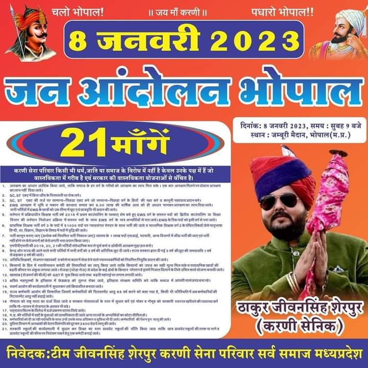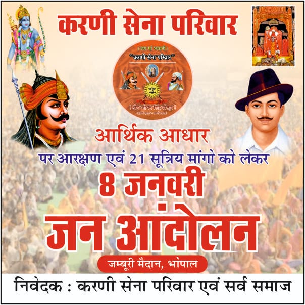 करणी सेना परिवार संगठन मंत्री श्री शैलेन्द्र सिंह ने बताया कि करणी सेना परिवार के साथ सर्व समाज द्वारा होने वाला 08 जनवरी का जनआंदोलन होकर रहेगा, जो की जम्बूरी मैदान भोपाल में होना है।
